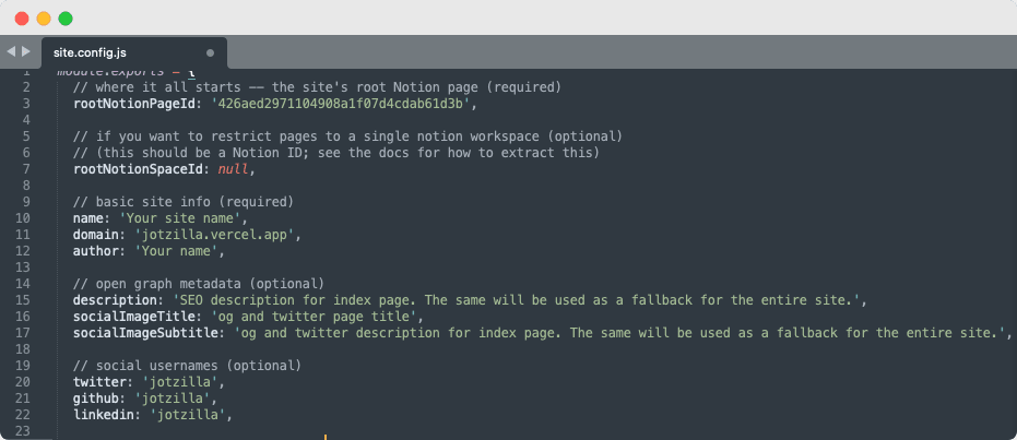 The rootNotionPageId value in the repo is my Notion page ID. You've to replace it with yours. You may change other site info values also.