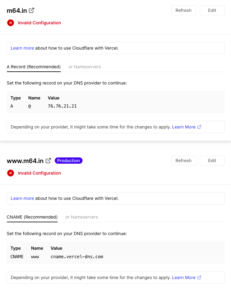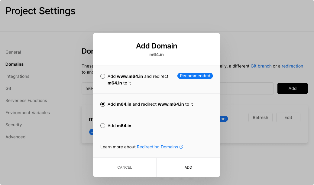 Visit the project settings and switch to the Domains section. This is where you can add a custom domain of your choice. Vercel will provide you with an A record and a CNAME DNS record. Visit your domain registrar and map those accordingly.